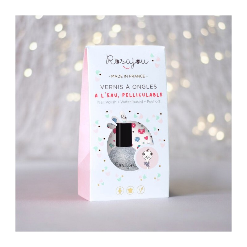 Vernis à ongles pour enfants – Argenté pailleté « Star » Formule vegan à base d’eau, sans solvant chimique. Flacon en verre – 5 ml Ce vernis argenté est l’indispensable de la collection Rosajou. Il peut être appliqué sur tous les autres vernis pour leur apporter de la brillance et de jolies paillettes. Essayez de l’appliquer par-dessus le vernis Madame pour un résultat éclatant digne d’une star. Présenté dans un joli étui aux couleurs de la marque et accompagné d’une adorable planche de tatouages à l’encre de soja. Utilisation : Comment l’enlever : Précautions d’emploi : Ingrédients : Vernis à ongles Star : Tatouages :