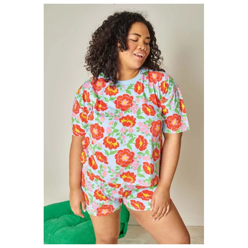 Un t-shirt oversize à la coupe parfaite (ni trop grand, ni sac à patates), un short bien pensé (ni trop court, ni trop long), et le tout en coton bio bien épais pour éviter l’effet chiffon après une nuit de roulades… ou un marathon de séries.