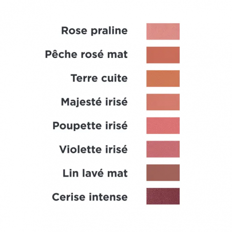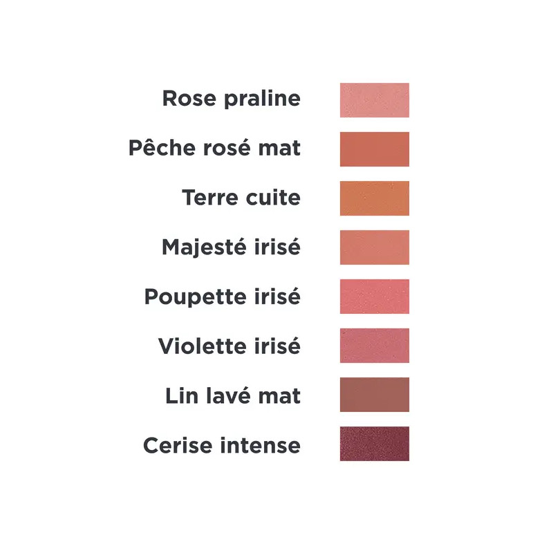 Coloris Pêche rosé mat Nous avons imaginé ce nouveau concept dans l’objectif de vous aider à adopter un mode de consommation plus juste et à réduire vos déchets liés aux emballages des produits de maquillage. Tous les produits sont en plus multi-usages et peuvent être utilisés sur toutes les parties du visage (paupières, joues, visage). La gamme est composée d’une part de recharges proposées dans un emballage minimaliste en carton recyclable et d’autre part, de jolis étuis aimantés qui accueillent ces recharges (boîtiers ou palettes de différents formats). Combien de recharges est-il possible de mettre dans les étuis ? Il existe 2 types d'étuis : 1) Les boîtiers : - Petit format : 1 fard à paupières - Moyen format : 1 blush ou 1 highlighter ou 1 correcteur ou 2 fards à paupières - Grand format : 1 poudre ou 2 blush/highlighter/correcteurs ou 1 blush/highlighter/correcteur + 2 fards à paupières ou 4 fards à paupières 2) Les palettes : - Petit format : capacité 12 fards à paupières mais à composer avec l’ensemble des recharges ! - Grand format : capacité 40 fards à paupières mais à composer avec l’ensemble des recharges ! MICA, TAPIOCA STARCH*, COCO-CAPRYLATE/CAPRATE, CELLULOSE, ZINC STEARATE, GLYCERYL CAPRYLATE, SIMMONDSIA CHINENSIS (JOJOBA) SEED OIL*, BUTYROSPERMUM PARKII (SHEA) BUTTER*, TOCOPHEROL, GLYCERYL UNDECYLENATE, HELIANTHUS ANNUUS (SUNFLOWER) SEED OIL, MALTODEXTRIN, MAY CONTAIN :, CI 75470 (CARMINE), CI 77742 (MANGANESE VIOLET), CI 77491 (RED IRON OXIDE), CI 77499 (BLACK IRON OXIDE), CI 77891 (TITANIUM DIOXIDE), CI 77947 (ZINC OXIDE), CI 77492, CI 77007 (ULTRAMARINES) Et pour ceux qui n'ont pas pris latin au lycée, voici en français les ingrédients : Mica, Amidon de tapioca*, Coco-caprylate/caprate, Cellulose, Stéarate de zinc, Glyceryl caprylate, Huile de graine de jojoba*, Beurre de karité*, Tocophérol (Vitamine E), Glyceryl undecylenate, Huile de graine de tournesol, Maltodextrine, Peut contenir :, Carmin, Diphosphate d'ammonium et manganèse, Trioxyde de fer, Tétraoxyde de fer, Dioxyde de titane (Colorant), Oxyde de zinc, Oxyde de fer, Ultramarine (Lazurite) * Ingrédients issus de l'agriculture biologique Certification : Produit cosmétique certifié Cosmos Organic par Ecocert Greenlife 100% du total est d’origine naturelle. 20% du total des ingrédients sont issus de l’Agriculture Biologique. Qualités et caractéristiques environnementales de l'emballage : Emballage entièrement recyclable contenant au minimum 23% de matière recyclée Lieu de fabrication : France