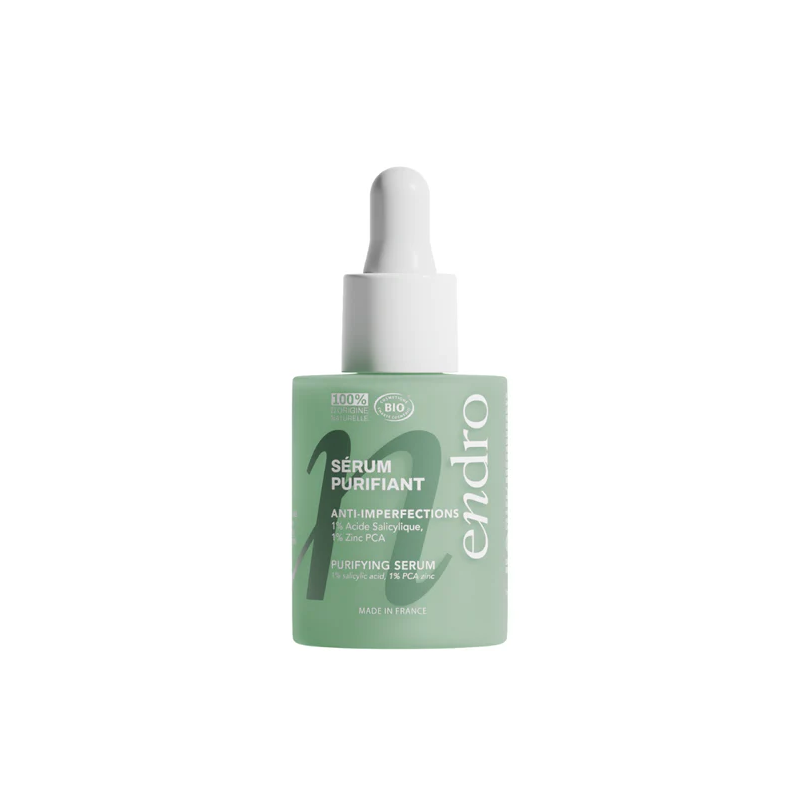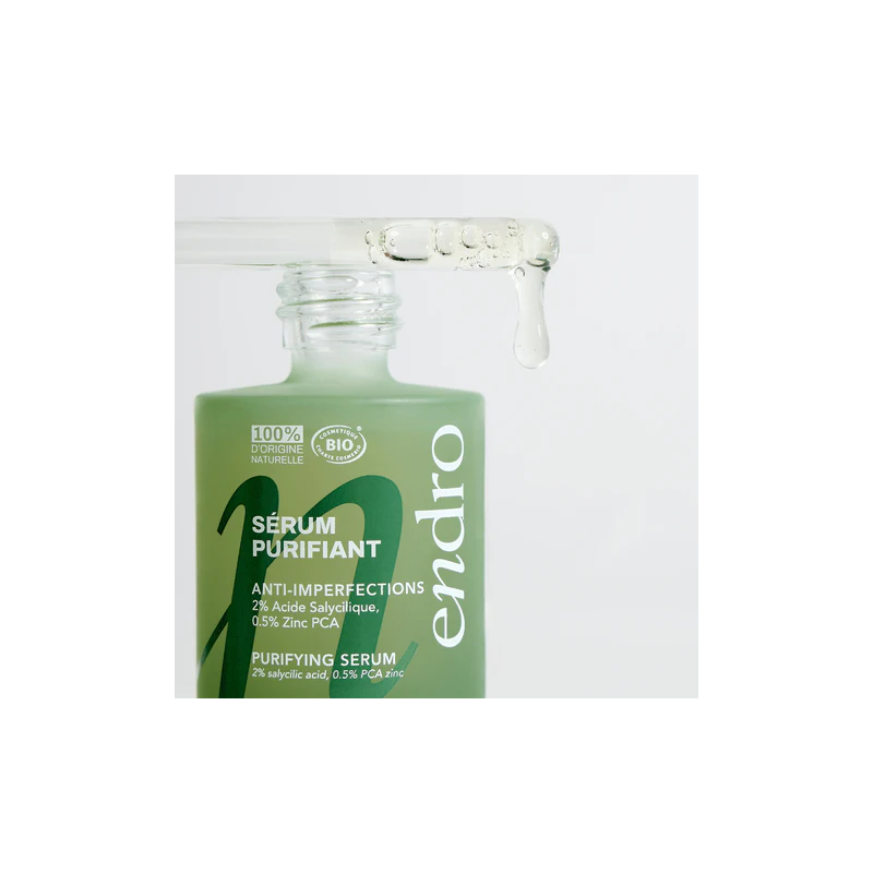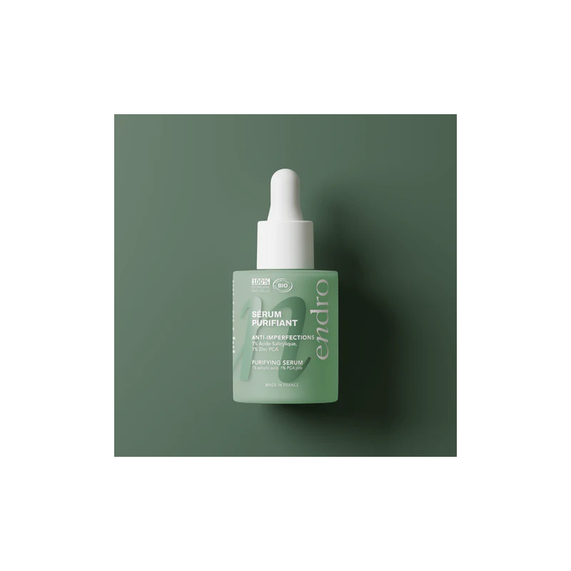 Offrez à votre peau une réponse ciblée avec le Sérum Purifiant Endro, spécialement formulé pour les peaux à imperfections, normales à mixtes. Ce soin concentré agit en profondeur pour réguler naturellement la production de sébum, limiter l’apparition des boutons et affiner le grain de peau, pour un teint plus net et équilibré. Sa formule hautement concentrée associe des actifs biologiques reconnus pour leurs propriétés purifiantes et régénérantes. L’huile de noisette, dont la composition est proche du sébum cutané, aide à matifier la peau, resserrer les pores et prévenir l’apparition des points noirs. L’huile essentielle de palmarosa stimule la régénération cellulaire et favorise la cicatrisation des imperfections, contribuant à une peau visiblement plus saine. L’huile essentielle de tea tree, aux propriétés antibactériennes et antiseptiques, purifie la peau, apaise les inflammations et aide à limiter la prolifération bactérienne. Le tocophérol (vitamine E) complète cette synergie en protégeant la peau du stress oxydatif et en renforçant son équilibre naturel. Ce sérum offre également une expérience sensorielle agréable, grâce à un parfum naturellement toasté et citronné issu des huiles essentielles. Sa texture huile sèche permet une application ciblée et efficace sur les zones concernées. Engagé dans une démarche responsable, ce soin est 99,8 % issu de l’agriculture biologique, 100 % vegan, certifié Cosmos Organic, fabriqué en Bretagne et noté 100/100 sur Yuka. Son flacon en verre recyclable reflète l’engagement de la marque pour une cosmétique durable et transparente. Intégré à une routine adaptée, le Sérum Purifiant Endro aide à améliorer visiblement l’apparence des imperfections tout en respectant l’équilibre de la peau. Régule la production de sébum Purifie et assainit la peau Accélère la cicatrisation des imperfections Matifie et resserre visiblement les pores Soin ciblé pour peaux à imperfections Texture huile sèche pour application locale Formule 99,8 % bio Certifié Cosmos Organic Vegan Fabriqué en Bretagne Note Yuka 100/100 Appliquer une goutte de sérum sur le bout du doigt, puis masser localement sur les zones à imperfections, de préférence le soir, jusqu’à absorption complète. Éviter le contour des yeux, les lèvres et les muqueuses. Usage externe uniquement, ne pas ingérer. Tenir hors de portée des enfants. En cas de contact avec les yeux, rincer abondamment à l’eau claire. Huile de noisette : séborégulatrice, elle matifie la peau, resserre les pores et aide à limiter l’apparition des imperfections. Huile essentielle de palmarosa : stimule la régénération cellulaire et accélère la cicatrisation des boutons. Huile essentielle de tea tree : antibactérienne et antiseptique, elle purifie la peau et aide à réduire les inflammations. Tocophérol (vitamine E) : antioxydant naturel, il protège la peau du stress oxydatif et renforce l’équilibre cutané. CORYLUS AVELLANA SEED OIL*, CYMBOPOGON MARTINI HERB OIL*, MELALEUCA ALTERNIFOLIA LEAF OIL*, GERANIOL**, TOCOPHEROL, LINALOOL**, LIMONENE**, CITRAL**, FARNESOL** * Ingrédients issus de l’Agriculture BiologiqueSérum Purifiant – Endro