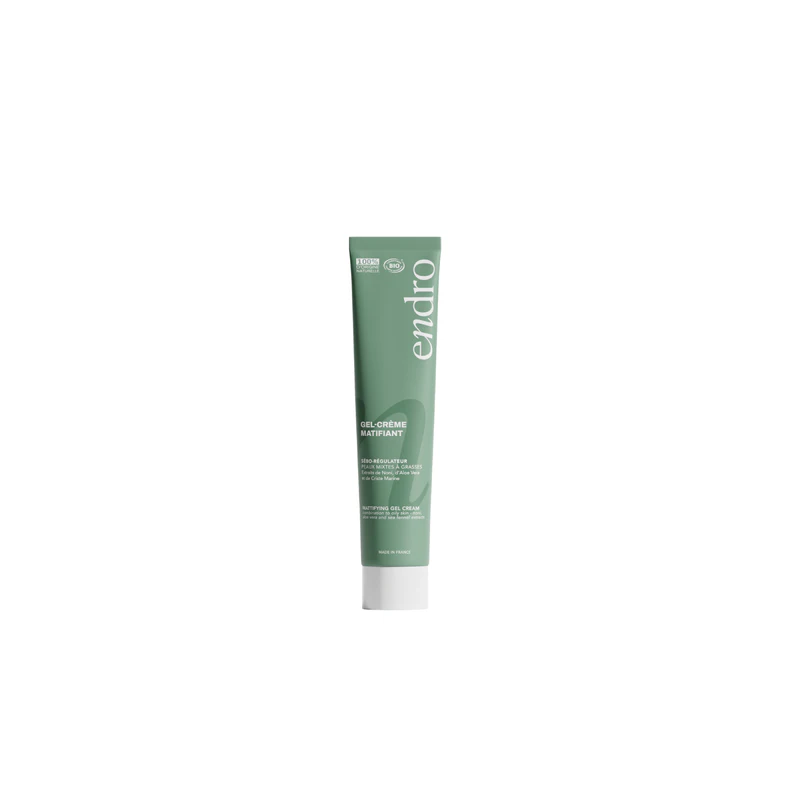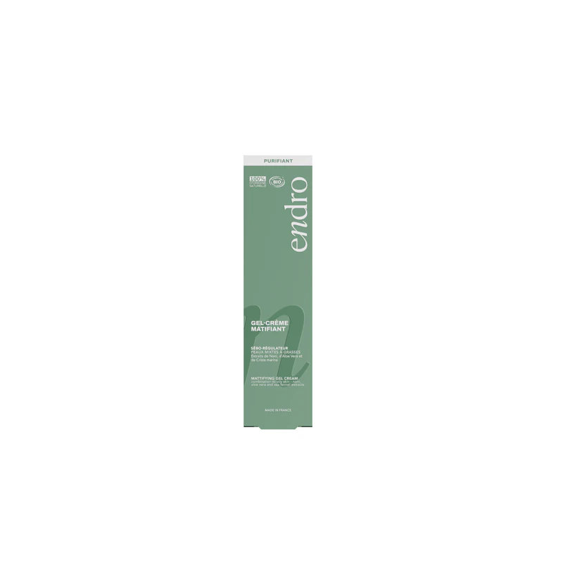 Découvrez le Gel-Crème Matifiant – Routine Purifiante Endro, un soin quotidien spécialement formulé pour répondre aux besoins des peaux mixtes à grasses, même sensibles. Il hydrate la peau en profondeur tout en régulant l’excès de sébum, pour un teint visiblement plus net et un fini mat naturel tout au long de la journée. Sa formule à base d’aloé vera biologique apporte une hydratation intense et apaise les sensations d’inconfort. L’extrait de noni, reconnu pour ses propriétés matifiantes, aide à réguler la production de sébum et à limiter les brillances. Associée à l’extrait de criste marine, cette synergie d’actifs naturels contribue à rééquilibrer la peau, à affiner le grain de peau et à préserver sa fraîcheur. L’huile de noisette, légère et rapidement absorbée, nourrit la peau sans effet gras et participe à l’amélioration de la texture cutanée. Sa texture gel-crème légère et non grasse pénètre rapidement, laissant la peau hydratée, confortable et parfaitement matifiée. Son parfum subtil offre une expérience sensorielle douce et équilibrée, idéale pour une utilisation quotidienne, seule ou avant le maquillage. Engagé dans une démarche responsable, ce soin est vegan, formulé à partir d’ingrédients d’origine naturelle et fabriqué en France. Son flacon pompe garantit une utilisation hygiénique et un dosage précis, pour une routine purifiante simple et efficace. Hydrate intensément sans alourdir la peau Régule l’excès de sébum et limite les brillances Fini mat naturel et durable Texture légère, non grasse, absorption rapide Convient aux peaux mixtes à grasses, même sensibles Formule vegan et naturelle Fabriquée en France Certifiée Agriculture Biologique française Appliquer matin et soir une noisette de gel-crème sur le visage et le cou propres et secs, en évitant le contour des yeux. Masser délicatement jusqu’à absorption complète. Peut être utilisé avant le maquillage pour prolonger sa tenue. Usage externe uniquement. Éviter le contact avec les yeux, les lèvres et les muqueuses. Ne pas ingérer. En cas de contact avec les yeux, rincer abondamment à l’eau claire. Tenir hors de portée des enfants. Aloe vera : hydrate intensément et apaise les irritations, assurant un confort durable pour les peaux mixtes à grasses. Extrait de noni : régule la production de sébum et matifie le teint, pour un aspect frais et équilibré. Extrait de criste marine : contribue à l’équilibre cutané grâce à ses propriétés purifiantes et régulatrices. Huile de noisette : légère et pénétrante, elle nourrit la peau sans effet gras et aide à affiner le grain de peau. AQUA (WATER / EAU), GLYCERIN, COCO-CAPRYLATE/CAPRATE, PENTYLENE GLYCOL, CORYLUS AVELLANA (HAZELNUT) SEED OIL*, HELIANTHUS ANNUUS (SUNFLOWER) SEED OIL*, GLYCERYL STEARATE, XANTHAN GUM, MARANTA ARUNDINACEA ROOT POWDER*, ALOE BARBADENSIS LEAF JUICE POWDER*, CRITHMUM MARITIMUM EXTRACT*, MORINDA CITRIFOLIA FRUIT EXTRACT, PARFUM (FRAGRANCE), SODIUM LEVULINATE, TOCOPHEROL, SODIUM ANISATE, LACTIC ACID, ACACIA SENEGAL GUM, SODIUM STEAROYL LACTYLATE, CAPRYLIC/CAPRIC TRIGLYCERIDE, LIMONENE**, LINALOOL**, GERANIOL**, CITRIC ACID * Ingrédients issus de l’Agriculture BiologiqueGel-Crème Matifiant – Routine Purifiante – Endro