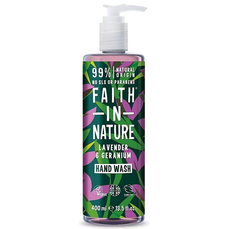 Instructions:Appliquer sur les mains mouillées, masser ensemble pour créer une mousse, rincer et sécher soigneusement.IngrédientsAqua, Ammonium laureth sulfate, Maris sal, Polysorbate 20, Huile de Lavandula angustifolia, Huile de Lavandula hybrida, Jus de feuille d'Aloe barbadensis, Huile de Pelargonium graveolens, Huile de feuille de Melaleuca alternifolia, Cocamidopropyl bétaïne, Sorbate de potassium, Benzoate de sodium, Acide citrique, Anthocyane, Linal Citronellol, GéraniolContenu: 400 mlFAITH IN NATURE