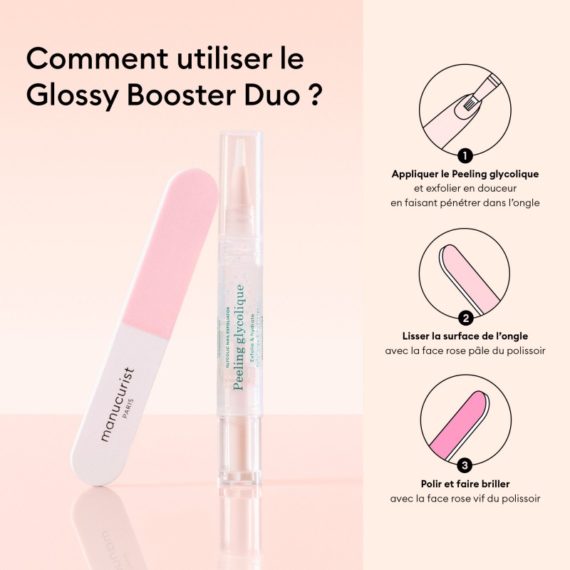Formule soin concentrée à 10% - Keratine végétale : nourrit intensément les ongles fragiles Résultats visibles prouvés - 85% trouvent leurs ongles plus durs* Application facile et rapide Sa texture fluide à base d'alcool ouvre les écailles de l'ongle pour une pénétration dans les couches profondes de kératine de l'ongle. Son absorption immédiate laisse l'ongle sans fini gras ni collant. Composé d'ingrédients d'origine naturelle à 97,5%** *Test clinique sous contrôle dermatologique sur 25 personnes après 2 semaines d’application. Kératine végétale - Nourrit intensément les ongles fragiles, les rendant plus résistants et moins sujets à la casse. AHA & Gluconolactone - Eliminent en douceur les cellules mortes et lisse la surface de l’ongle, tout en maintenant l’hydratation naturelle, pour des ongles renforcés. Silicium - Améliore l'élasticité des ongles, prévient la casse et le dédoublement, et favorise une meilleure hydratation pour des ongles plus solides et résistants. Biotine (Vitamines B8) - Stimule la production de kératine et aide à renforcer les ongles, réduisant ainsi leur fragilité et le risque de casse et de dédoublement. Vitamine C - Agit comme un bouclier antioxydant pour protéger l’ongle des agressions extérieures. Comment utiliser le Glossy Booster Duo ? Routine glossy nails en 3 étapes : 1. Peeling glycolique : répartir la matière sur la surface de l'ongle nu, puis masser jusqu'à pénétration pour exfolier en douceur. La formule s'absorbe naturellement, sans besoin de rinçage ni retrait. 2. Face rose pâle du Polissoir : polir légèrement de façon perpendiculaire à l'ongle, toujours dans le même sens, pour lisser la surface et gommer les imperfections. 3. Face rose vif du Polissoir : lustrer la surface de l'ongle pour refermer les écailles et faire briller. Routine à réaliser 2 à 3 fois par semaine pour un effet ongles brillants longue durée. (À partir de 12 ans) ?? Astuce de pro - Complétez la routine en apportant une touche d’hydratation grâce à l’Huile verte, pour des ongles nourris et éclatants. aqua, pentylene glycol, propanediol, polyacrylate crosspolymer 6, glycolic acid, citric acid, alcohol, glycerin, tris(tetramethylhydroxypiperidinol) citrate, glycyrrhiza glabra (licorice) root extract, sodium benzoate, potassium sorbate 96% d'ingrédients d'origine naturelle* *Calcul basé sur la norme internationale ISO 16128. Liste INCI aqua, pentylene glycol, propanediol, polyacrylate crosspolymer 6, glycolic acid, citric acid, alcohol, glycerin, tris(tetramethylhydroxypiperidinol) citrate, glycyrrhiza glabra (licorice) root extract, sodium benzoate, potassium sorbate 96% d'ingrédients d'origine naturelle* *Calcul basé sur la norme internationale ISO 16128.