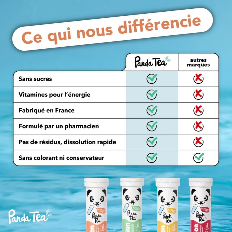 Les pastilles d’hydratation Panda Tea sont une solution innovante contenant des électrolytes et des vitamines spécialement conçue pour booster l’hydratation et l’énergie.