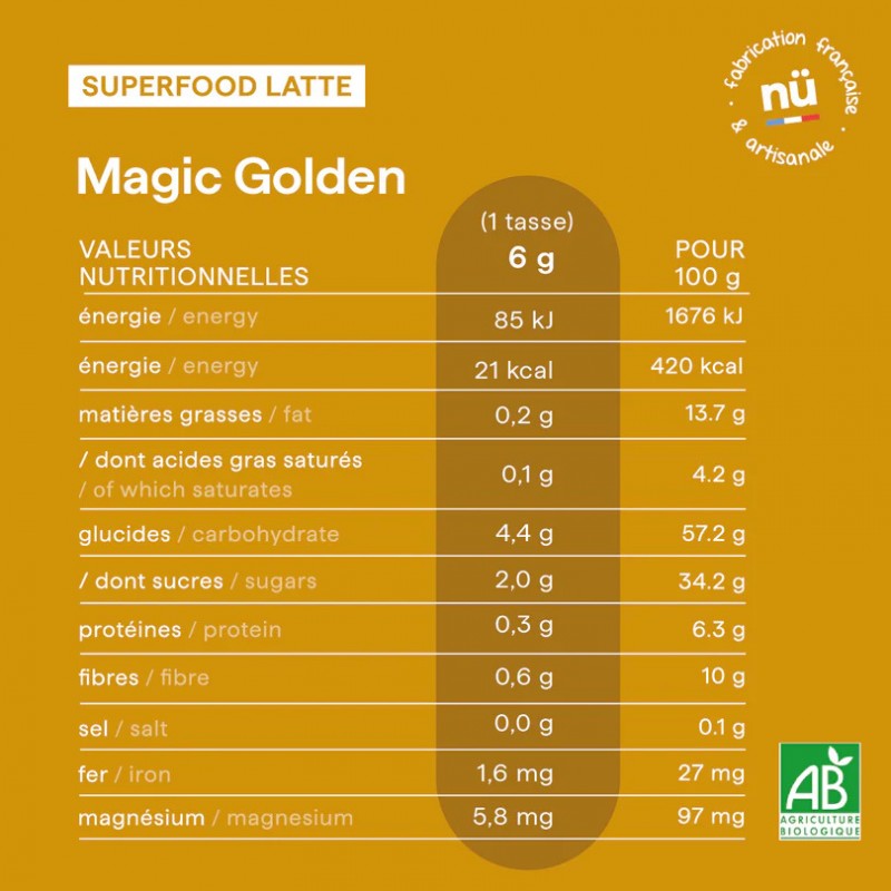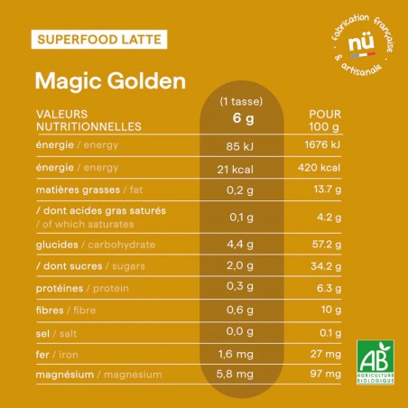 100 % bio et sans additifs, Magic Golden est sucré naturellement avec une touche de sucre de fleur de coco, un édulcorant à indice glycémique bas et riche en nutriments, pour une douceur équilibrée et nutritive.
