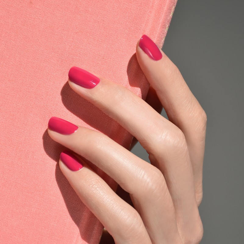 ethyl acetate, butyl acetate, nitrocellulose, hydroxyethyl acrylate/IPDI/PPG-15 glyceryl ether copolymer, acetyl tributyl citrate, isopropyl alcohol, bis-HEMA poly(1,4-butanediol)-9/IPDI copolymer, stearalkonium bentonite, ethyl trimethylbenzoyl phenylphosphinate, phosphoric acid, diacetone alcohol, BHT, silica, CI 15850 (red 7 lake), CI 73360 (red 30), CI 77891 (titanium dioxide), CI 19140 (yellow 5 lake)