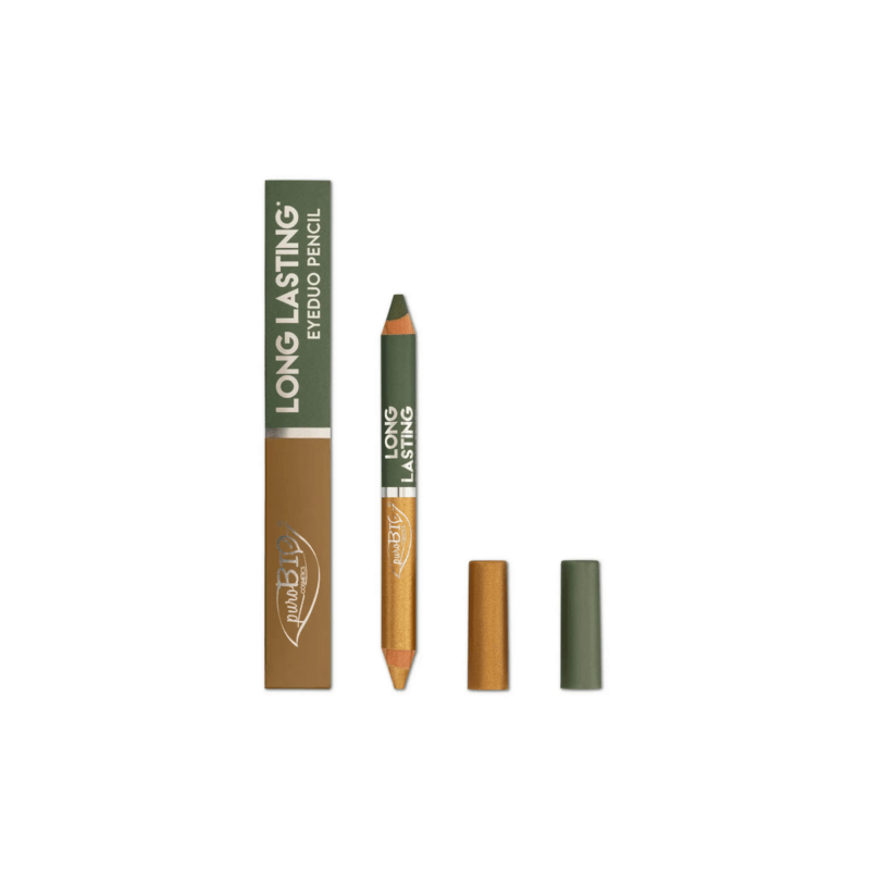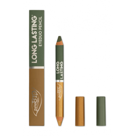 Le Crayon Yeux Duo Long Lasting - Purobio séduit par sa composition riche en cires naturelles, huiles végétales et pigments minéraux, offrant un maquillage confortable, lumineux et modulable tout au long de la journée.